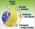 Le principe de cette opération de recyclage de balles de tennis usagées consiste à collecter ces balles auprès des pratiquants pour à terme pouvoir parrainer des associations caritatives en les dotant de sols sportifs.